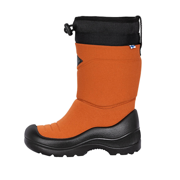 This heavy duty snow boot in a beautiful orange is designed and manufactured in Finland. It will allow children to play outside without having cold or wet feet.