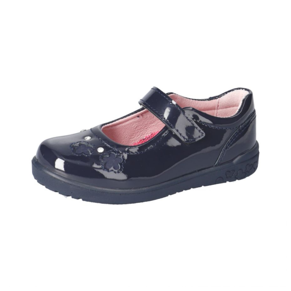 Chaussures pour filles de type ballerine Mary Jane en cuir marine lustré. Souples et légères. Faciles à ajuster avec une attache velcro. Facile à agencer avec les tenues de tous les jours!