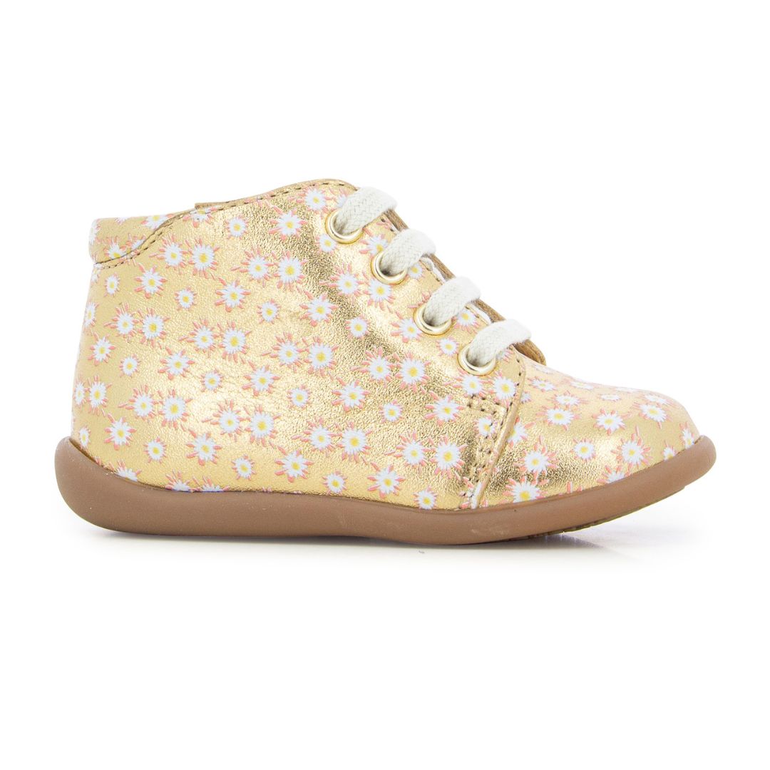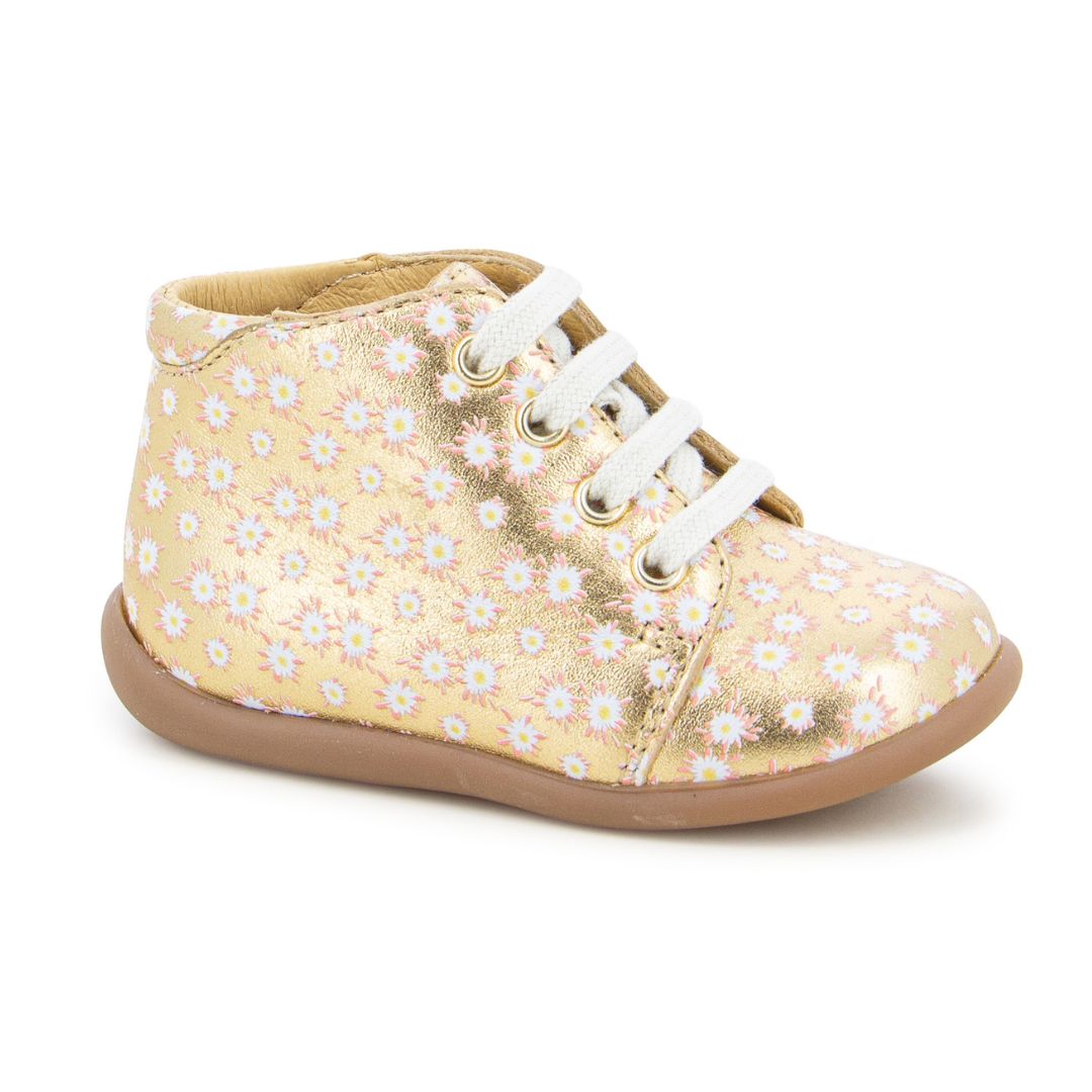 Voici une chaussure stylée de Pom d'Api Paris, pour les premiers pas de vos filles dans un bel imprimé fleuri métallisé doré.