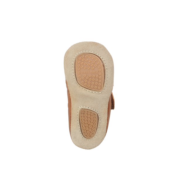 Un chausson en cuir ultra souple de la marque danoise Petit Nord, parfaite les bébés. La semelle est une combinaison de daim souple et de caoutchouc antidérapant.